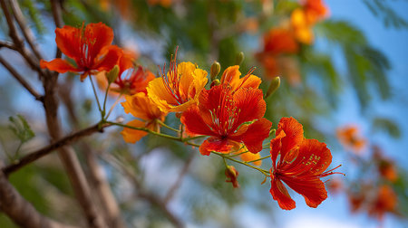 Vibrant Flame Tree Blooms Displayed Against a Gentle Sky Background