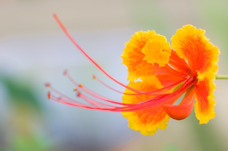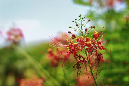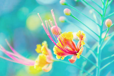 Blurred flowers. Tropical flower background. Caesalpinia pulcherrima, Peacock’s crest, Barbados Pride. Photo with shallow depth of focus. Abstract blurred turquoise floral background.