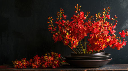 Myanmar's Thingyan flower, also known as padauk, delicately arranged on a table against a dark background, symbolizing the essence of springtime and cultural celebration in Myanmar