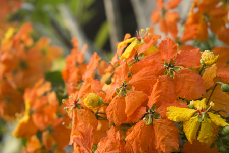 The photo shows tropical orange flowers like framboyant. Fixed exotic flowers in the jungle forests of the Dominican Republic. Exotic flowers are rare and beutiful.