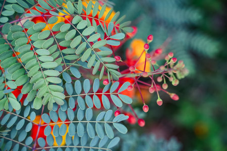 pride of barbados Plant Caesalpinia Pulcherima green leaves and orange and red flower buds background. Natural geometric minimalist botany texture