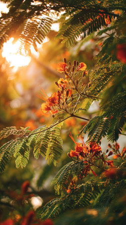 The Royal poinciana at sunset, Golden red sunset light filters through the leaves, still atmosphere, warm orange glow blending with natural green