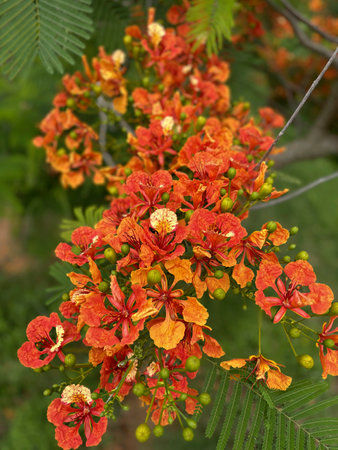 Beautiful phoenix tree, orderly arrangement of fiery red flowers and green leaves