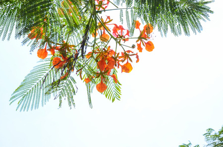 Orange flowers and buds of The flame tree or Royal poinciana are on brushes and white sky background.
