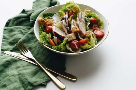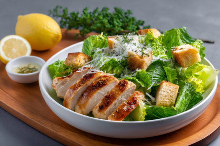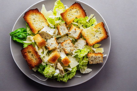 Healthy chicken caesar salad with golden croutons and fresh lettuce leaves