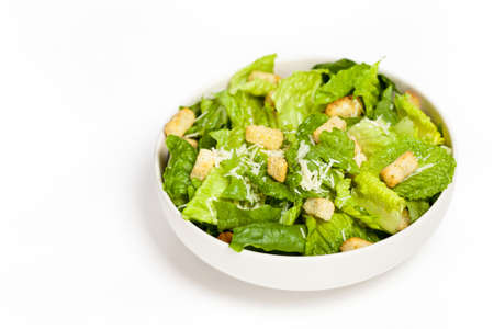 A fresh and crisp Caesar salad featuring romaine lettuce, crunchy croutons, and grated parmesan cheese served in a white bowl. Perfect for healthy eating!