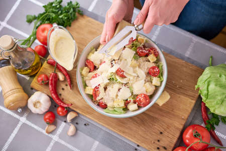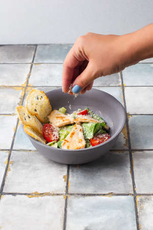 Healthy organic Chicken Caesar Salad with grilled chicken and croutons woman hand