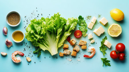 Top view of caesar salad ingredients: green lettuce, cheese, croutons, peeled shrimp, tomatoes and garlic. Generative AI.