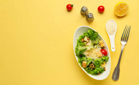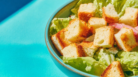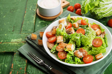 Fresh caesar salad with crunchy croutons on bright background for culinary inspiration