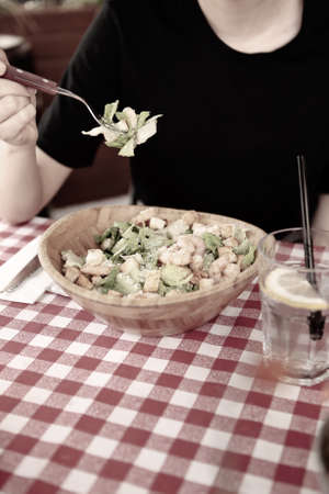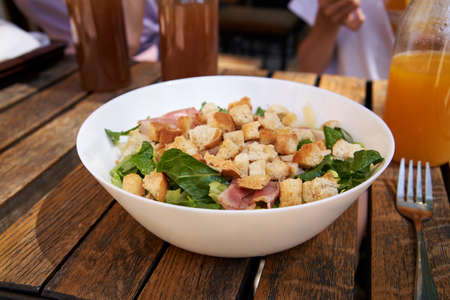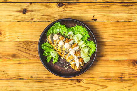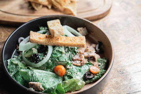 Caesar salad with chicken and greens on wooden table, Caesar salad in an expensive restaurant