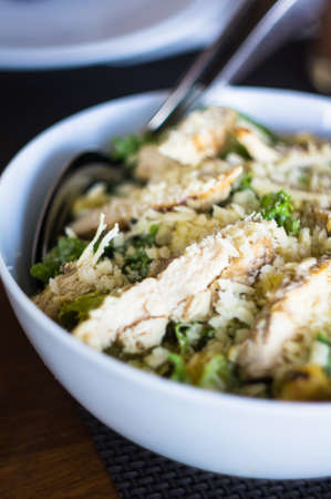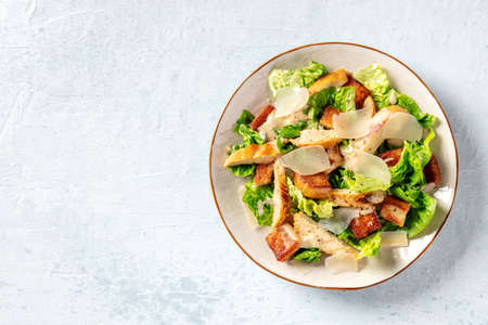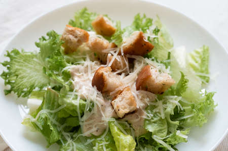 Caesar Salad with grilled chicken, Cheese and Croutons with lettuce, on plate. Grilled chicken breasts and fresh vegetables in plate.