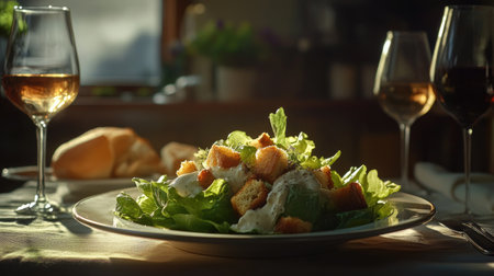 A beautifully presented fresh green salad with croutons features a soft ambiance, accompanied by glasses of wine in an elegant dining setting.
