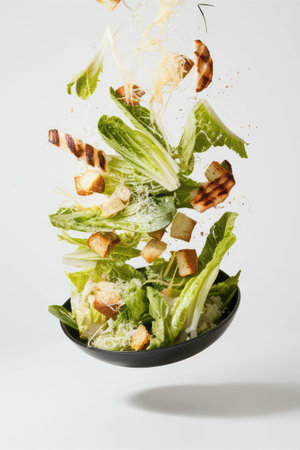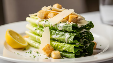 A classic Caesar Salad, featuring fresh, crisp lettuce, crunchy croutons, and creamy dressing, perfectly presented on a plate. This vibrant and healthy dish is captured in a studio shot, emphasizing its freshness, simplicity, and delicious appeal, ideal for healthy eating and indulgence.