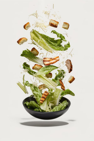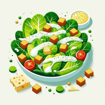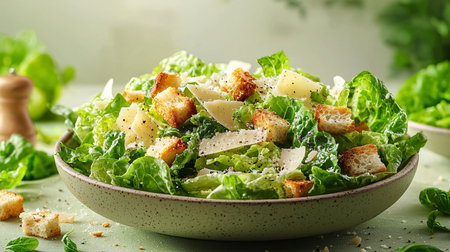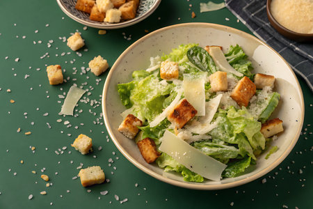 A vibrant Caesar salad featuring fresh greens, crunchy croutons, and shavings of parmesan on a rich green background, perfect for any meal.