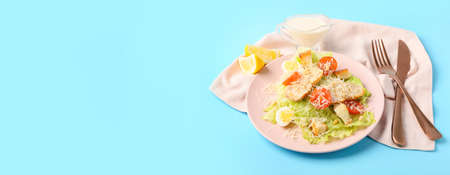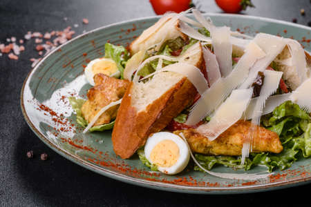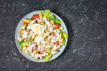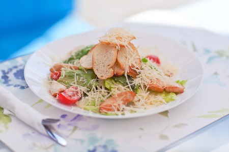 Delicious fresh caesar salad with chicken meat, breadcrumbs, tomatoes and lettuce leaves. Healthy food
