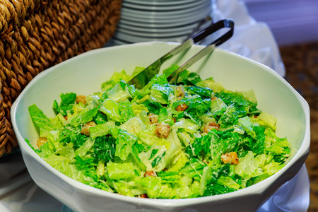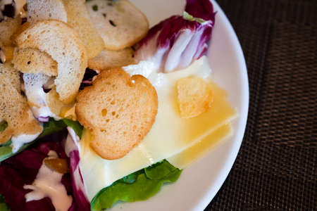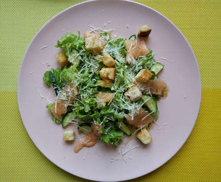 Lettuce salad with cheese and crouton in a white dish. Food delivery.