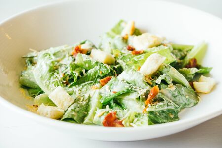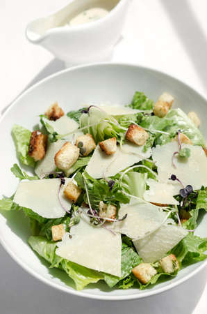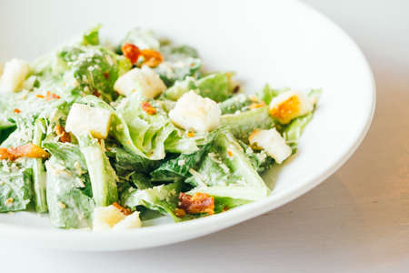 Close up organic caecar salad in white dish with caecar dressing. International food - Image