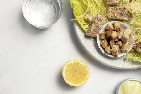 Homemade Caesar Salad with romanine, cheese, croutons, chicken, lemon and sauce. On white wooden background