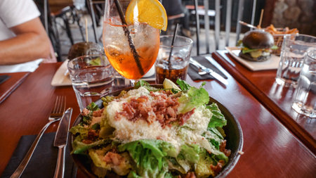 Caesar salad with lettuce, croutons and bacon outdoors, with drinks and people having lunch in the background