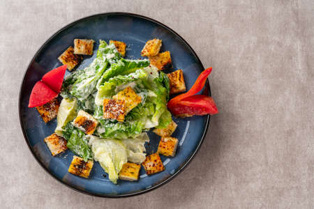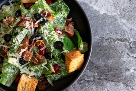 Fresh Caesar salad in a black plate on a gray background. Top view.