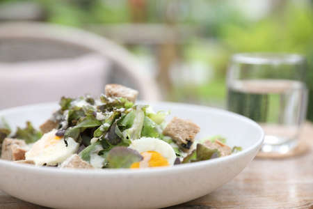 Caesar salad with quail eggs and chicken meat. Fresh side dish with vegetables on wooden table, restaurant serving, top view