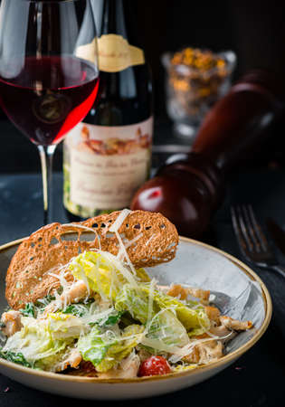 Delicious Caesar salad in a ceramic bowl., top view of traditional Caesar Salad on dark background