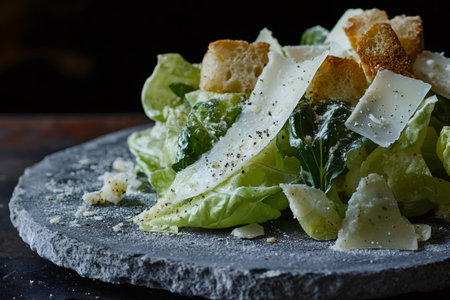 Close up of appetizing Caesar salad featuring romaine lettuce, croutons, parmesan cheese, and dressing, served on a dark stone plate
