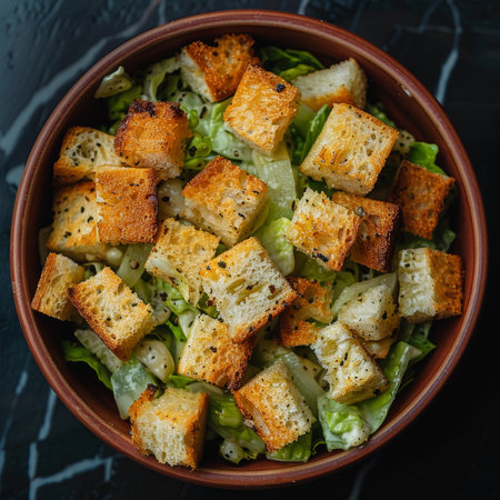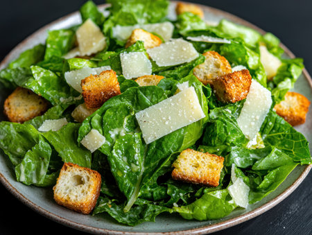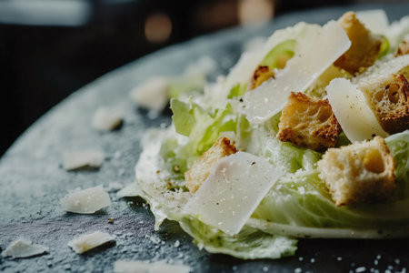 Close up of appetizing Caesar salad featuring croutons, parmesan cheese, and lettuce, served on a dark plate, creating a visually appealing culinary scene