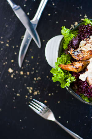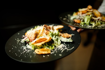 Fresh vegetable with chesse in Caesar salad in black bowl on the dark background