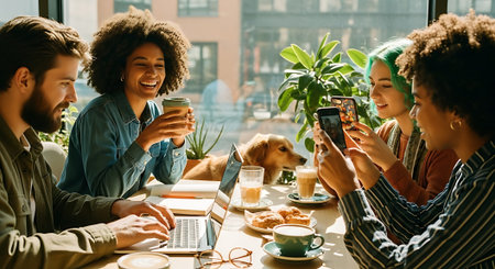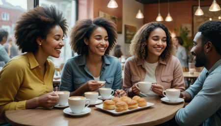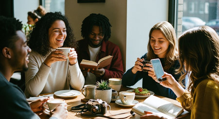 A group of friends enjoying coffee and food at a cafe, smiling and engaging with each other, some reading and using phones