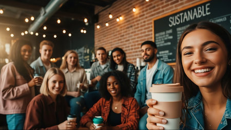 A group of young adults enjoying coffee in a cozy cafe, with one woman smiling at the camera while holding a cup, plants on the table