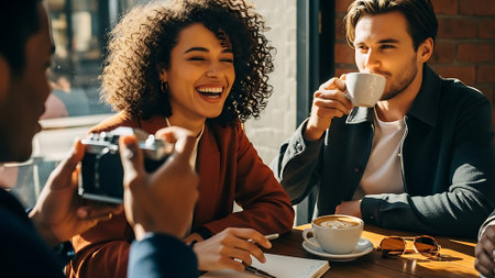 A joyful couple in a cafe, one taking a photo of the other, both smiling, with coffee cups on the table, surrounded by friends