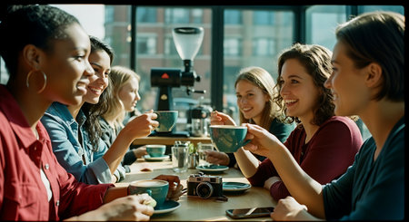 A group of diverse women enjoying coffee and conversation together in a modern cafe