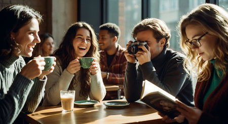 A group of friends enjoy coffee and conversation at a cafe, with one person taking a photo and another reading a book, surrounded by warm lighting and comfortable atmosphere.