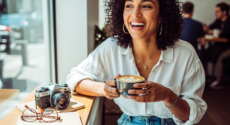 A happy woman in a white blouse holding a cup of coffee, with a camera and glasses on the table in a bustling cafe.