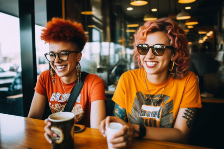 Generative AI : Two young women having fun drinking coffee at the bar