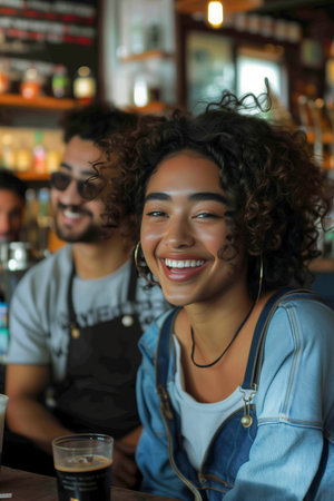 A candid moment of laughter shared between friends from different cultural backgrounds at a local coffee shop, their genuine smiles reflecting the universal language of joy.