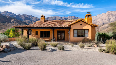 A beautiful adobe house set against a backdrop of stunning mountains, offering a serene escape into nature with rustic charm and inviting surroundings.