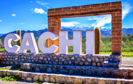 The sign by the entrance to the town of Cachi in the Calchaqui Valleys of Argentina. South America