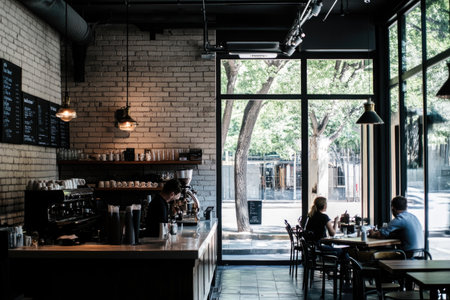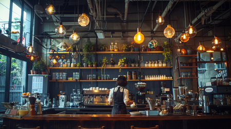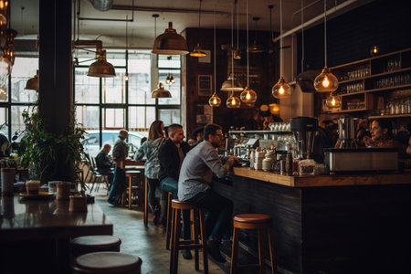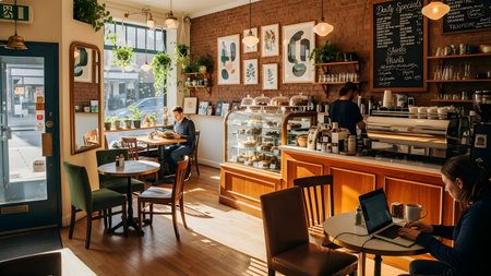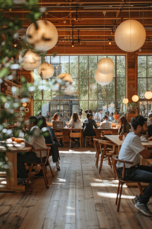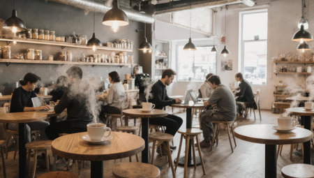 An interior shot showcases a cafe environment bustling with activity. Individuals are seen working and socializing. The scene is illuminated by natural light, the composition highlights coffee machines. This image is suitable for various commercial uses, including website design, advertising, and editorial content.