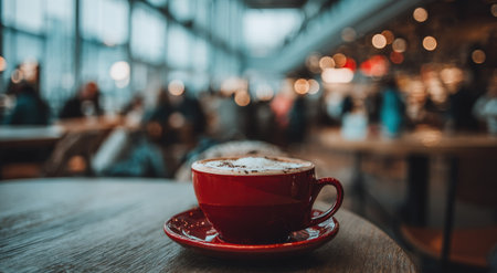 A red coffee cup, filled with cappuccino, sits on a saucer atop a wooden table. The image features a shallow depth of field, with a blurred background suggesting an indoor setting like a cafe or restaurant. Soft lighting and bokeh effects add warmth. Suitable for various commercial and editorial applications.