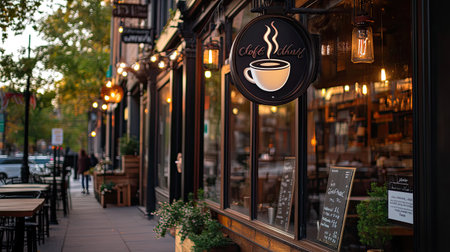 A quaint coffee shop exterior showcases warm lights and an inviting design, perfect for casual meetings or relaxation. An ideal urban gathering spot.
