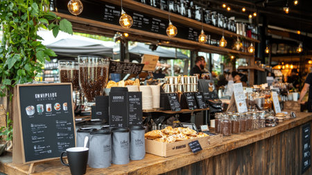 A warm and inviting coffee shop scene featuring a wooden counter with delicious pastries and coffee. A perfect spot for social gatherings and relaxation.