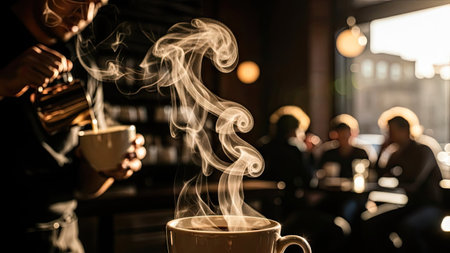 A barista pours a hot beverage into a cup, with steam rising dramatically. The image showcases soft lighting, creating a warm and inviting atmosphere. The composition includes blurred figures in the background, suggesting a cafe setting with potential use in promotional materials or editorial content.