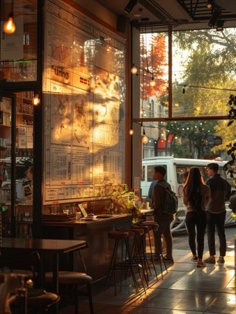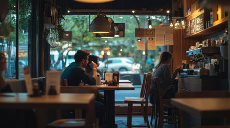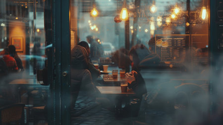 A city cafe glows warmly as dusk sets in, its windows offering a peek into the social hub where coffee and conversation flow.