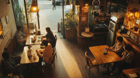 A cozy coffee shop corner with wooden tables, warm lighting, and people chatting in a relaxed atmosphere.