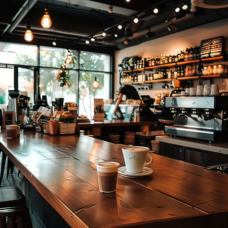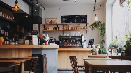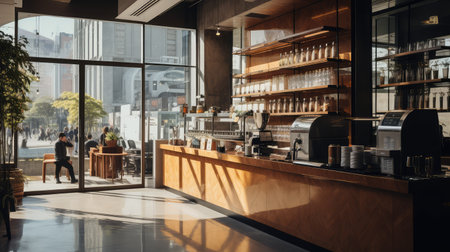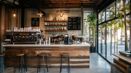 A stylish coffee shop interior featuring a wooden counter, high stools, and natural light streaming through large windows, creating a warm and inviting atmosphere.