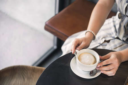 Coffee cup with cream on table in coffee shop, stock photo