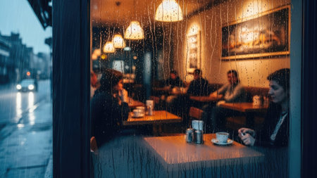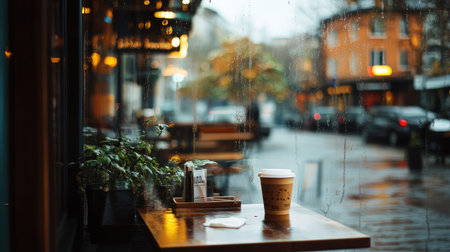 This image captures a cozy coffee shop ambiance with raindrops on the window, showcasing a quiet street scene, perfect for relaxation and contemplation.