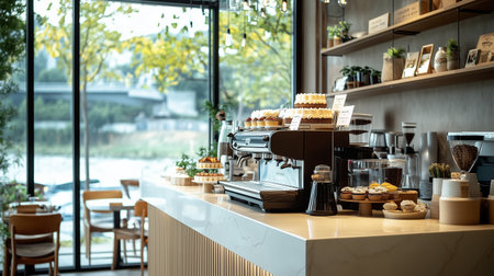 A cozy café interior featuring a modern coffee bar, delicious pastries, and bright natural light during afternoon hours